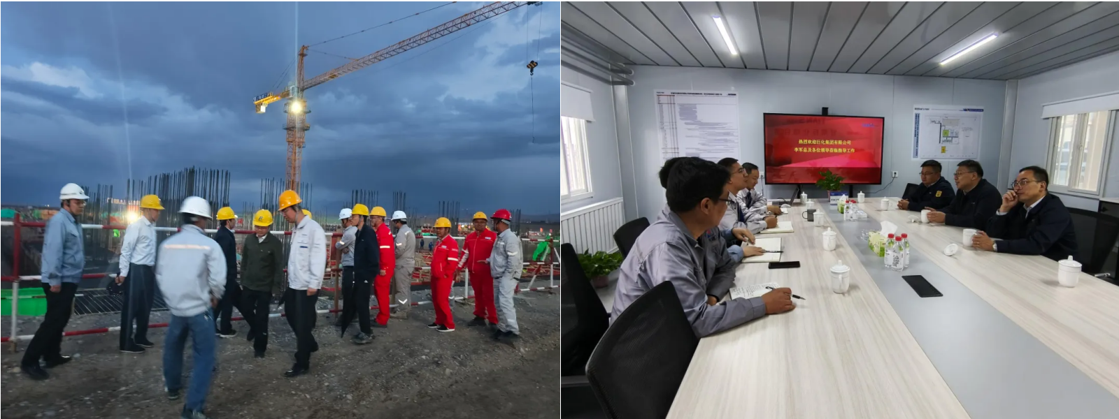 圖丨左:天俱時(shí)項(xiàng)目部及聯(lián)合體成員開(kāi)工儀式合影;右:項(xiàng)目夜間施工掠影